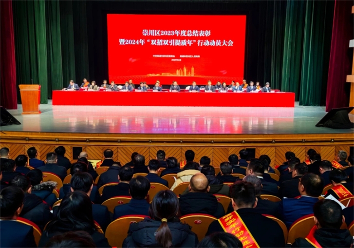 2月5日,,,,,崇川区召开2023年度总结表扬暨2024年“双招双引提质年”行动发动大会,,,,,发动全区上下以先进典范为模范,,,,,以蛟龙出海的气焰、生龙活虎的劲头、龙腾万里的精神,,,,,迅速掀起抓招商、攻项目热潮,,,,,奋力拼抢首季“开门红”,,,,,为“聚力‘新四年’、提升首位度”争做孝顺。。。。。。。区委书记胡拥军出席大会并讲话,,,,,区委副书记、区长杨万平主持大会。。。。。。。